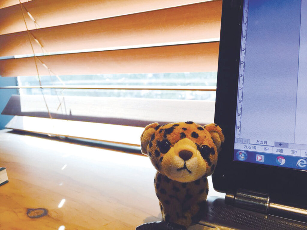 이름은 치치. 치치를 데려온 곳은 에버랜드의 어느 기념품 숍. 최은미 작가는 얼굴은 무표정이나 양 손바닥의 자석 때문에 여러 동작이 가능한 치타 인형 치치와 함께 곧잘 자신의 심리상태를 반영한 마감놀이(!)를 한다. “너무 오래 원고를 써서 힘이 들면 노트북 자판에 엎드려 울고 있는 치치의 사진을 찍어 SNS에 올리는 식이다. <아홉번째 파도>의 퇴고 원고를 완성했을 땐 프린트된 원고 위에 치치를 올려두고 기념사진을 찍었다.” (치치가 외롭지 않게 혹은 최은미 작가가 외롭지 않게 둘은 외출도 종종 함께한다고.)